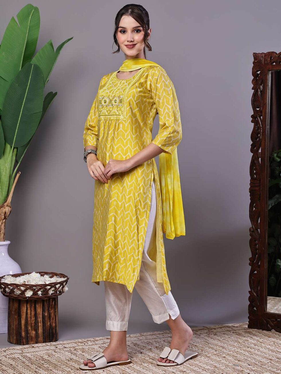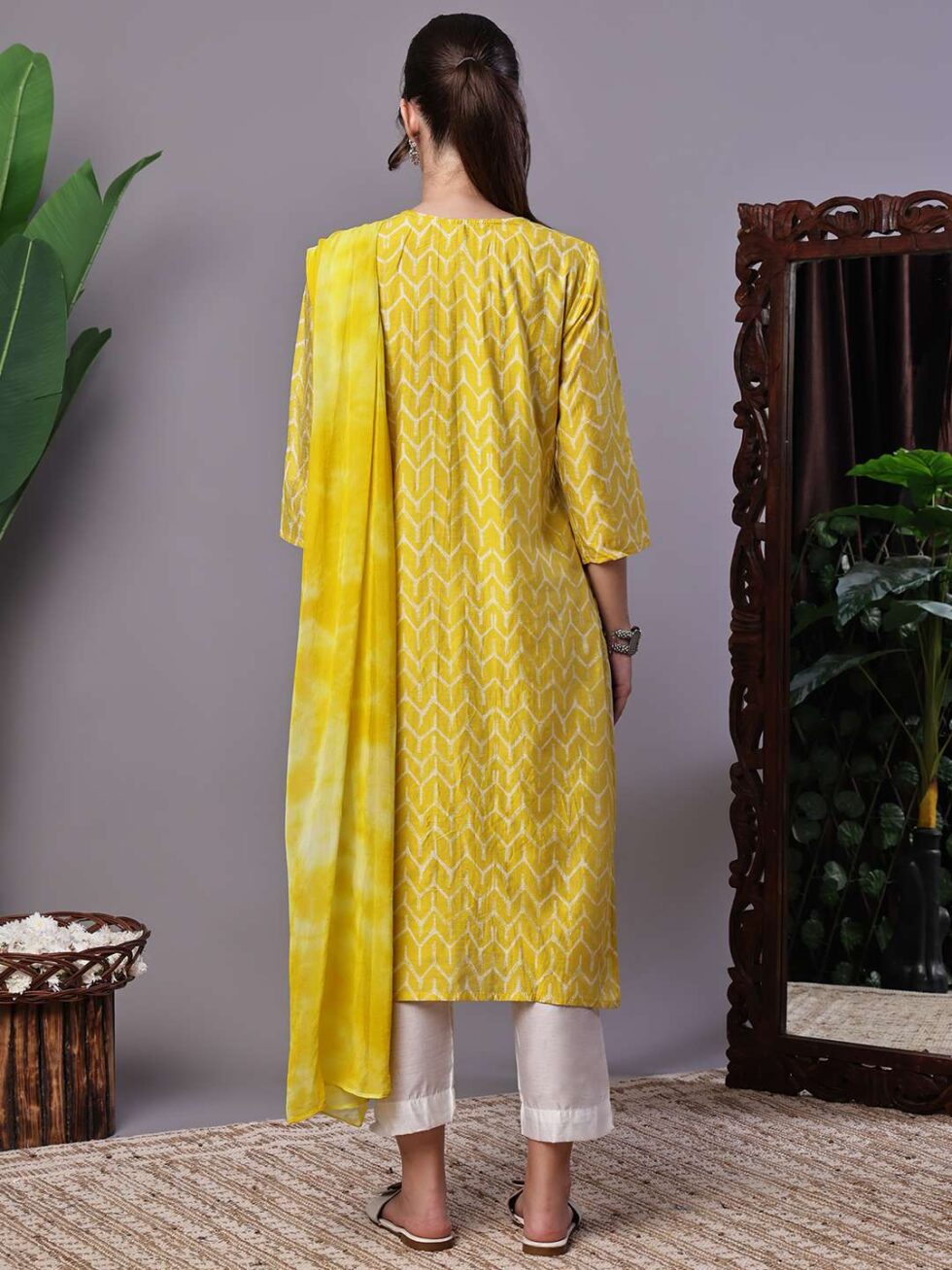 Women’s Mustard Yellow Chevron Print Chanderi Kurta Set with Mirror Work Suit Sets