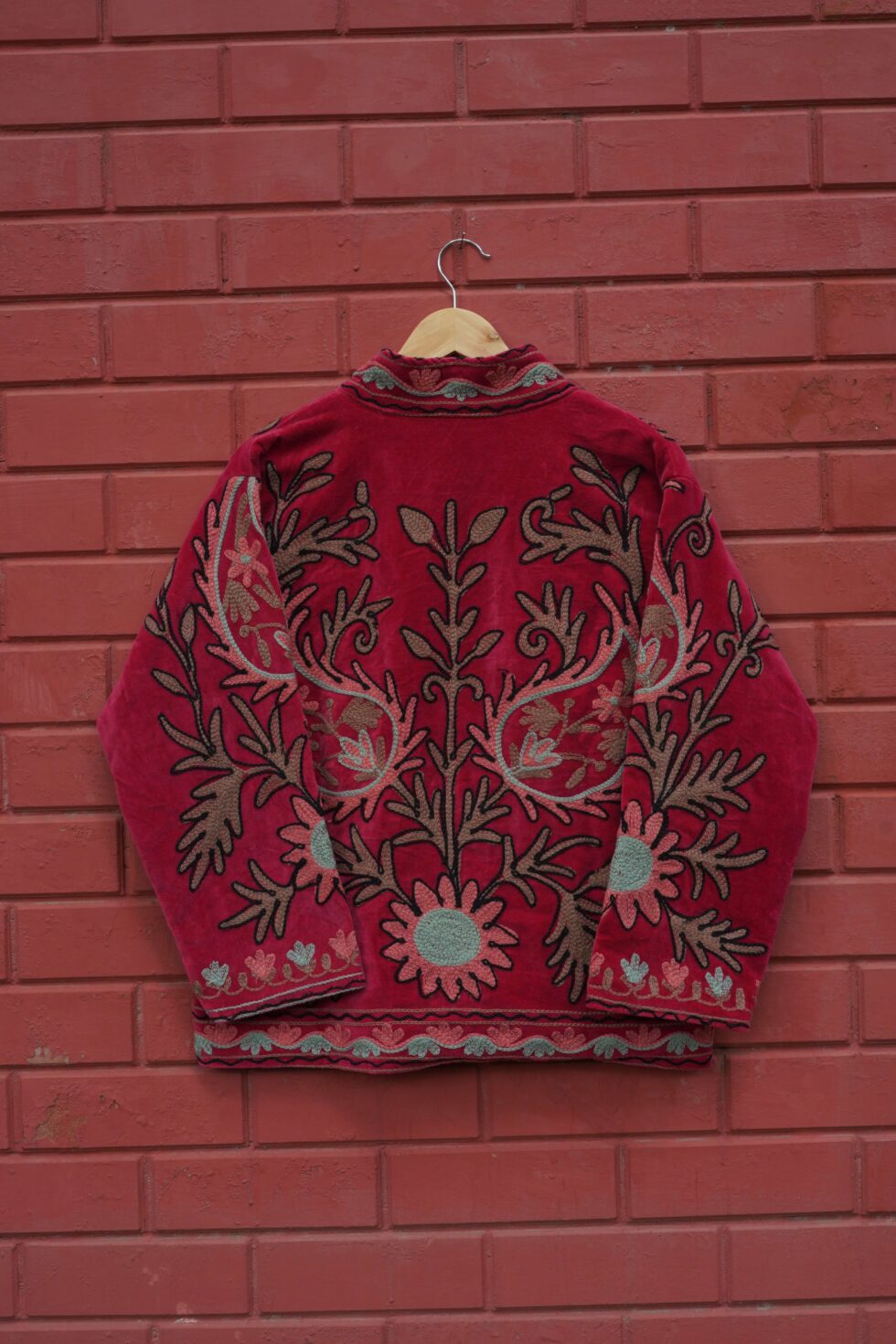 Womens Red Velvet Embroidered Jacket with Floral Design